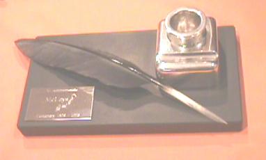 A large independent Welsh printer wanted to celebrate 100 years in business with their customers and present them with a fitting memento of the occasion. As the origin of printing stems from the written word, House of Logos suggested that an inkwell and writing quill mounted on a mahogany wood base with an engraved plaque would be an ideal way to commemorate the occasion. The director of the company was delighted with the suggestion but made an important amendment to the design. The mahogany wood base was to be replaced with a Welsh slate base to signify the companies' Welsh origins.